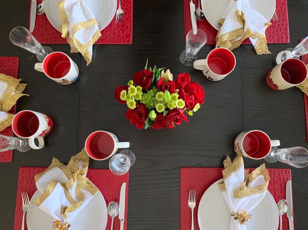 Tuck & Tate did not grow up celebrating Christmas, but adopted the holiday when their parents got married. What they have learned over the years of celebrating is that Christmas breakfast should be quick and easy. No one wants to spend their morning slaving in the kitchen when there are presents to be opened and an exciting day getting started. With that in mind, we have created a quick and easy tablescape and menu to help you plan your Christmas morning festivities. We chose red and gold for our theme and used items that we have collected over the years to keep the cost of this look festive but at a reasonable price.