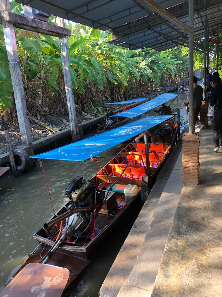 Day 2- Bangkok Dine in a Boat: we spent the morning traveling to a floating market, which was absolutely one of the highlights of our trip. We splurged and ended up using a private guide for this as opposed to a large tour group and we really enjoyed the private experience because we were able to ask our guide tons of questions about all the foods that vendors sell in the markets. After a 90 minute drive, we were taken by boat from the outer canals to the center of the floating market. From there you float from stall to stall and purchase any foods you want to try. We suggest coming hungry! After a lap through the canals we were dropped off to visit the shops on the streets of the market. The vendors sell mostly cheap souvenirs if that is your thing, but there are also some art vendors, spice vendors, and a number of sit down restaurants. We sampled a few things from the markets and purchased a few souvenirs before heading back to the hotel.