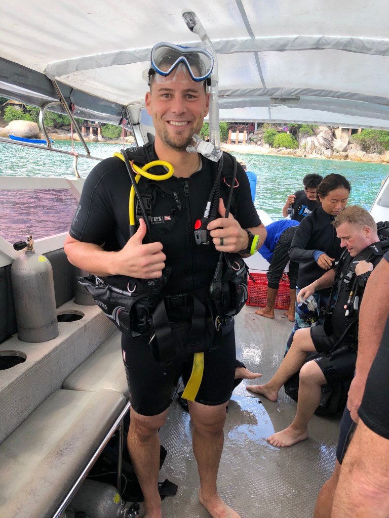 Day 6 – Koh Samui – Set Sail: One of the primary reasons we decided on going to Koh Samui was so that Tuck’s dad could scuba dive. Koh Samui has some of the best access to dive sites in the country, which are about an hour away on a speedboat. We booked the trip via The Dive Academy and highly recommend them for any scuba trips in Koh Samui.