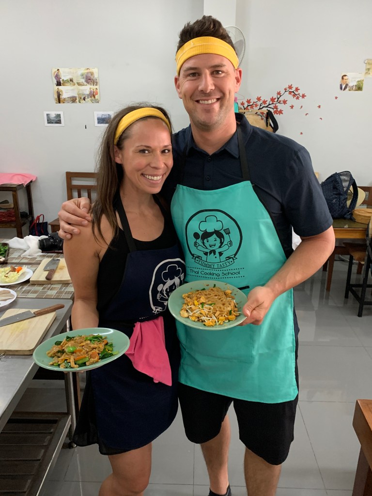Day 9 – Chiang Mai – Take a Cooking Class: One of the signature activities in Chiang Mai is to take a cooking class. We booked a class at the Yummy Tasty Thai Cooking School via AirBnb Experiences. Noodle, our host, picked us up at our hotel and took us to a local food market. She gave a great presentation about different Thai ingredients, how to pick them, and what dishes they are used in. After the market trip was a quick drive to her cooking studio. We loved this class and recommend it to anyone in Chiang Mai because you each get to pick 5 dishes to make during cooking class. This means that between the two of us, we were able to make two soups (Tom Yum and Tom Kha Gai), two appetizers (Green Papaya Salad and Thai Spring Rolls), two noodle dishes (Pad Thai and Pad See Ew), two curry pastes and two curry dishes (Khao Soi and Massaman Curry), and two desserts (Mango with Sticky Rice and Coconut Sweet Potato Rice). We paid $55 total for the two of us, left so full we needed a nap afterwards, and learned so much about Thai food. An absolute must-do if you are in Chiang Mai!