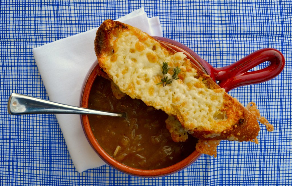 - Pour the soup into bowls and place a Gruyere toast on top. Serve immediately.