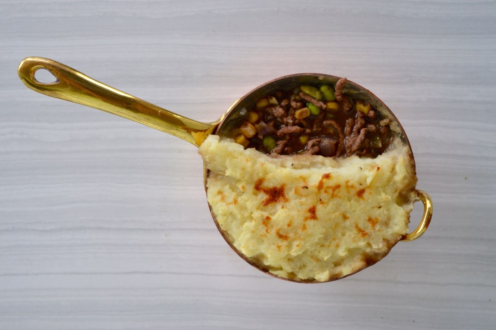- Spray each of the four ramekins (or a deep 9 x 9 x 2 baking dish) with cooking spray. Evenly distribute the filling among for four ramekins or into an even layer in a baking dish. Top with mashed potatoes, being sure to completely spread the potatoes to the edges to create a seal over the filling. Bake the shepherd’s pies for 20 minutes, or until the potatoes are golden brown. If they haven’t browned in the 20 minutes, turn your oven onto a high broil and cook for another 3-5 minutes. Let the shepherd’s pie rest for at least 10 minutes out of the oven before serving.