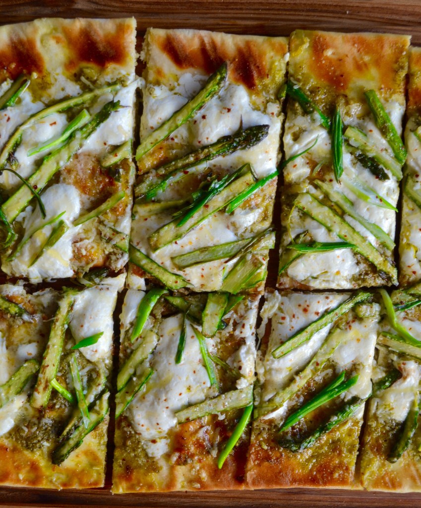 - When the pizza is halfway cooked, top the pizza with the toppings. If you have a thick pesto you can add 1 tbs+ of olive oil to help it spread better onto the dough. Spread the pesto around the dough, leaving 1 inch of crust around the entire edge of the pizza. Drain the burrata of any brine and spread that on top of the pesto. Add the cooked asparagus, red chili flakes, and fresh green onions.