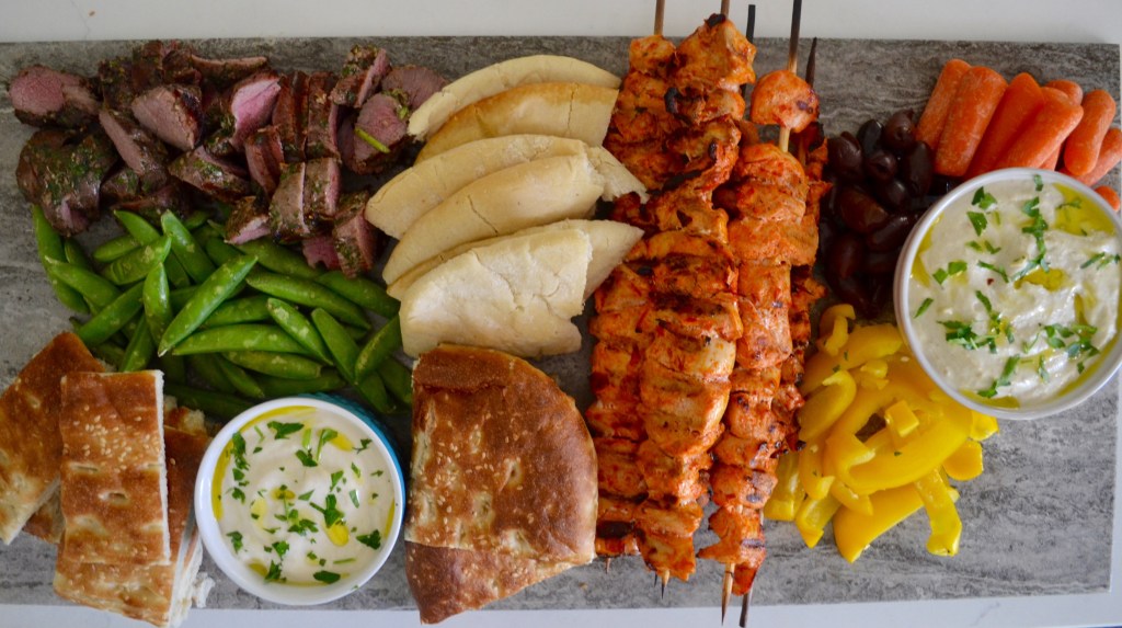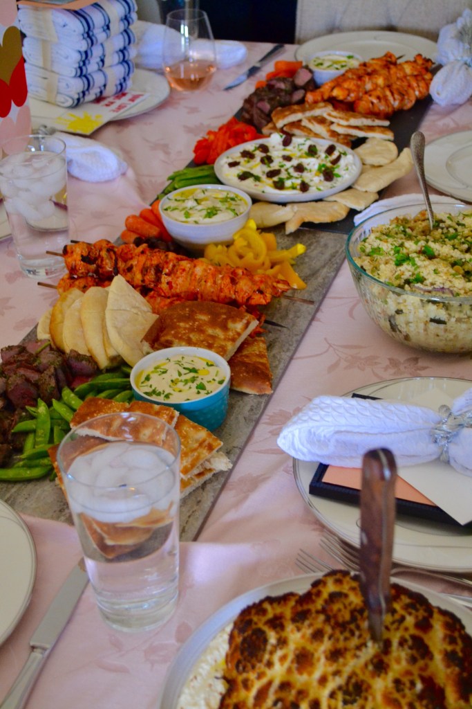 The final preparation for lunch was pretty easy with the help of a few extra hands. We had Tate’s dad grill the lamb and chicken in the backyard, Tuck’s dad on roasted cauliflower duty, and the Tuck’s mom assembling the platters. The key to any platter, as you can read from our cheese board assembly posts, is that more is more. We divided the dips into small ramekins so that each platter had a little bit of everything and filled the boards with veggies and pitas once the entrée kabobs were cooked. The visual is stunning and almost overwhelming- they are always a crowd pleaser!