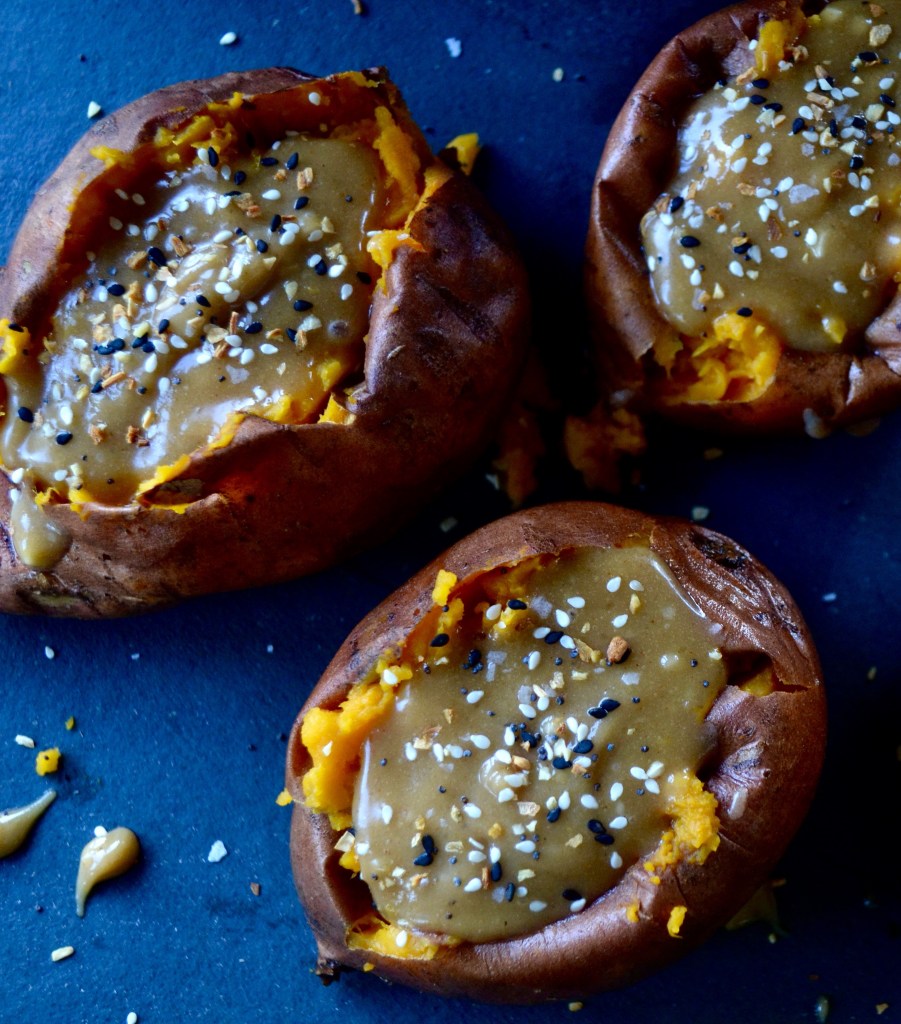 Roasted Sweet Potatoes with Sweet & Spicy Tahini Butter