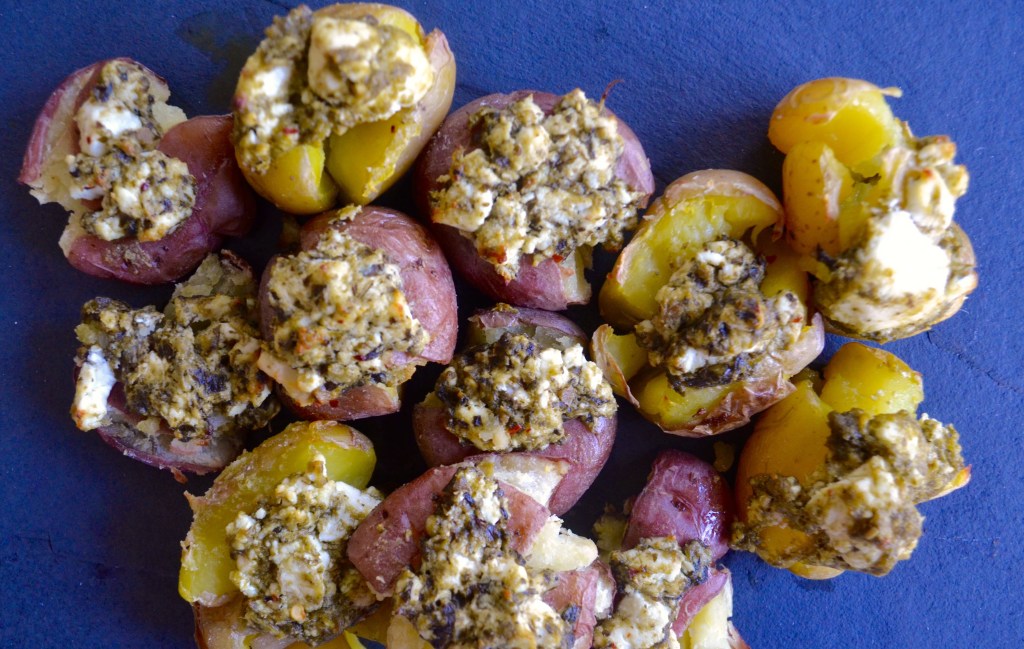 - Drizzle the olive oil over the potatoes and add a hearty dollop of the pesto/goat cheese mixture on top of each potato. Place the potatoes in the oven for another 30 minutes until the are crispy and the cheese mixture is fully melted.