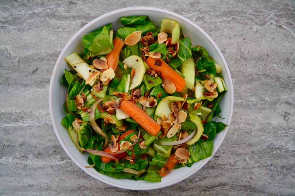 We buy bok choy all of the time to pair with our favorite Asian recipes like Mapo Tofu and our Steamed Mushroom Buns. Some of the dishes we make are admittedly heavy and need a veggie side kick to balance things out. We usually sauté bok choy on high heat with a bunch of garlic, but now that the weather is getting warmer we decided to mix things up and serve it raw. Bok choy is a leafy green and is a great crunchy substitute for lettuce in a salad. Use this recipe as a “fridge clean out recipe” and toss in any veggies you have on hand. Bell peppers, avocado, and diced mushrooms would all make great additions to bulk the salad up.