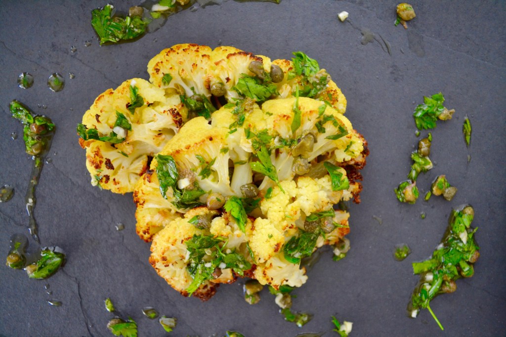 - When the cauliflower has finished cooking, remove it from the oven and use a spatula to transfer it to a serving dish. Serve with a generous pour of the caper sauce and serve immediately.