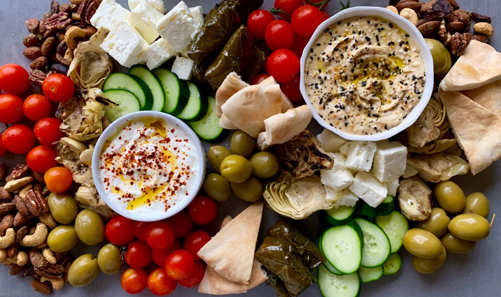 Creating an appetizer board is our go-to vehicle for feeding mouths as they walk through our door. There is always a little something for everyone and for some reason having more appetizers feels less stressful than having one and hoping it’s a winner. We love Greek food and often make a dinner party menu featuring this type of cuisine. Keeping that in mind, we set out to make a board of Greek appetizers (mezze) that mostly stays away from our traditional meat and cheese boards. If you feel like over-achieving you can make many of these items from scratch, but to save time we have purchased them from Trader Joe’s. Pro Tip: whenever we purchase a pre-made dip from the grocery store, we always give it a little TLC before serving. For this board we used Trader Joe’s labneh and hummus; we transferred each into smaller bowls and drizzled olive oil and red chili flakes on the labneh and olive oil and everything spice on the hummus. It’s a small touch that makes the board look better and less like you just got home from the grocery store.