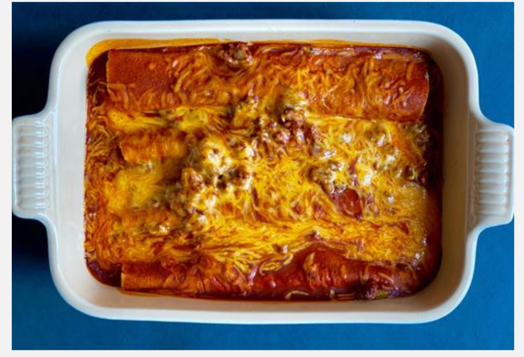 - Put 1/4 – 1/2 cup of the beef mixture into a tortilla and roll in up as thinly as possible. This does not have to be perfect, just try to be consistent with portions. Place the tortilla in a large baking dish (must be at least 2 inches deep). Continue this process until the baking dish is full with tortillas. If you have extra ground beef, pour it over the top of the tortillas.