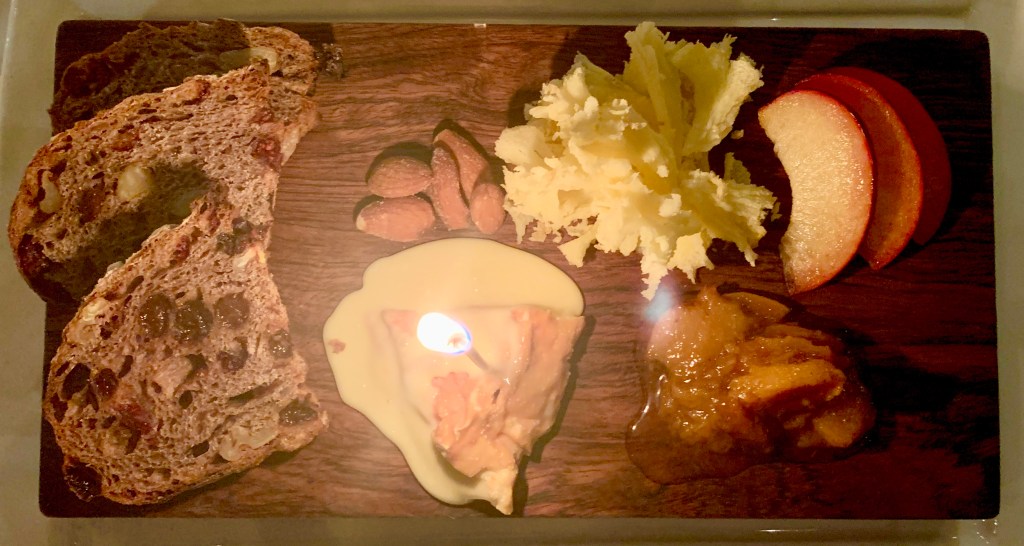 We had a lot of fun with this course since we could pick and choose our own adventure. Calli and Jamie opted for the cheese course and the boys chose dessert. Our waiter helped us navigate the 8+ offered cheeses based on our preferences of texture and funk. Jamie was a bit more adventurous and went with two pungent options while Calli went for milder cheese, and were both very happy with our selections. The cheeses were presented on a personal cheese board with fresh bread, fruit, fig jam, and roasted almonds. The boys both chose the milk chocolate creme brulee and were very happy with their sweet selection.