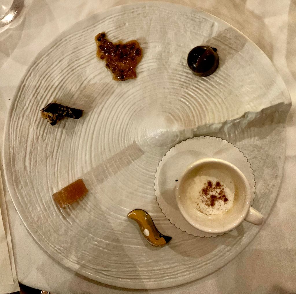 6th Course – Six Textures of Chocolate. As we were getting full we thought “there’s no way we can eat more”, but as this final course came to the table we knew we were willing to make more room. A playful presentation of chocolates on a dish that was shaped like a painter’s palate. The palate included a traditional chocolate truffle, chocolate brittle, hazelnut biscotti, pate de fruit sweetened with cocoa sugar, a chocolate curry truffle, and last but not least, a miniature pumpkin white chocolate latte. The desserts were small and decadent; the most luxurious way to end a delicious dinner.