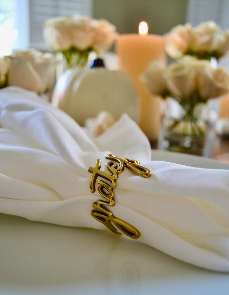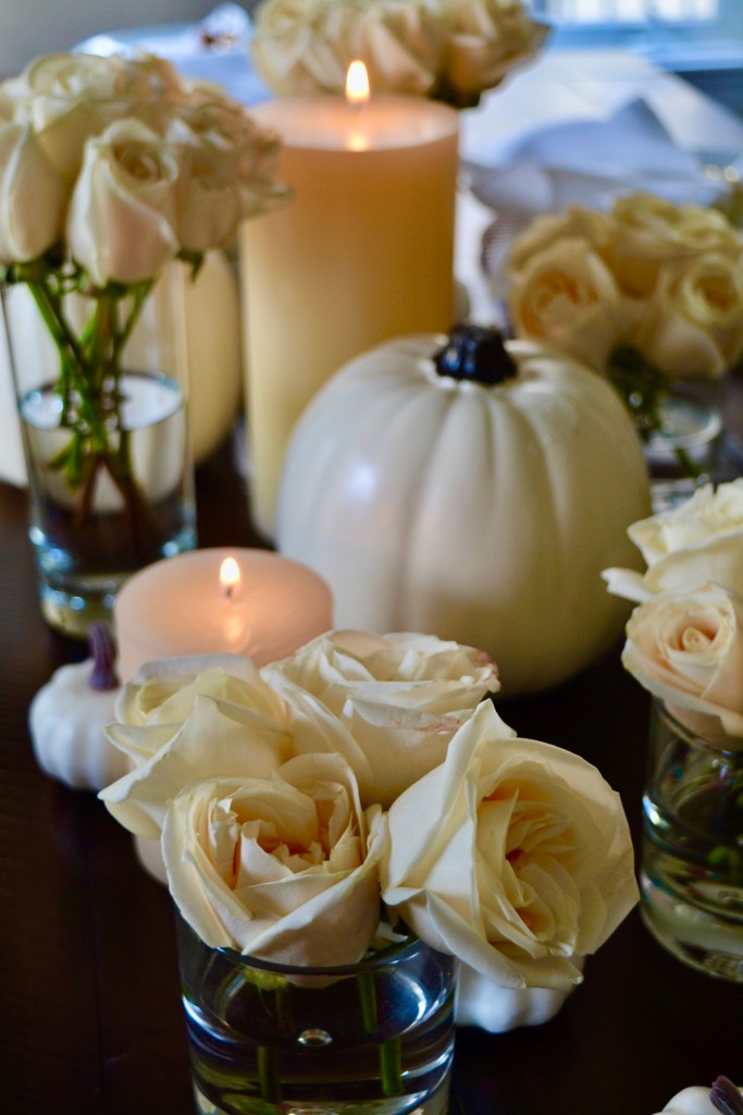 We know that your Thanksgiving might be smaller this year, but that doesn’t mean that it should be any less celebratory and special. For our table this year, we have chosen to combine a bunch of different shades of whites and creams for a rustic chic look. We used ivory pillar candles from Crate & Barrel, various sizes of white pumpkins we found on Amazon, and bouquets of white roses that we divided into small arrangements across the table. If you don’t have small vases, short water glasses are a great substitute! We completed our look with rattan chargers from Pottery Barn, white dishes, napkins from Chilewich, and an assortment of gold napkin rings from Crate and Barrel. We particularly love the “grateful” napkin rings they are selling this year! The overall look is simple, elegant, and very easy to pull together.