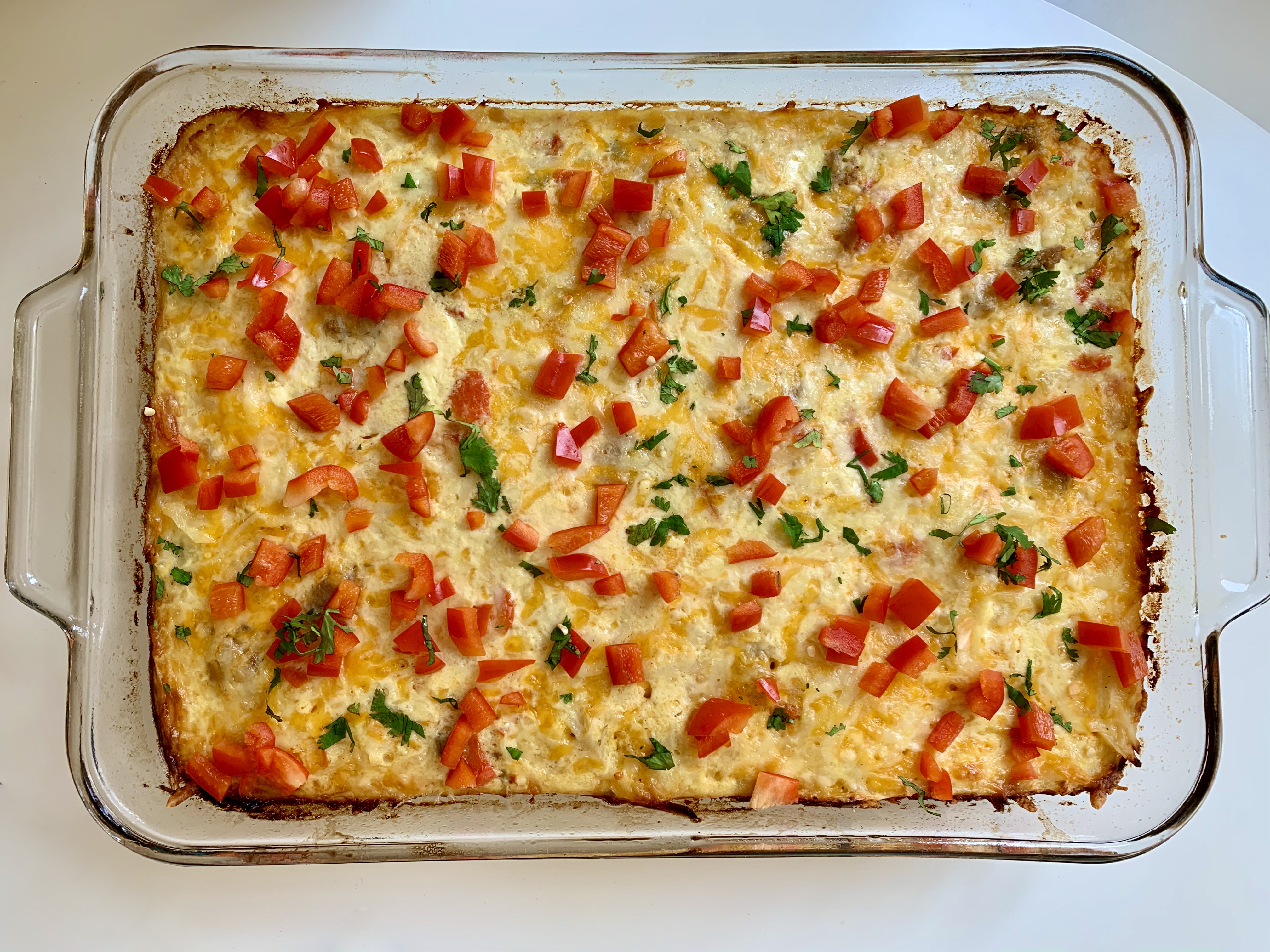 - Pour the mixture into your baking dish and spread everything into an even layer. Top with the remaining shredded cheese and bell peppers, cover with foil, and bake for 45 minutes. Remove the foil after 45 minutes and bake another 10 minutes to melt the cheese. Wait a few minutes out of the oven before serving so that the casserole can set. Serve with hot sauce, if desired.