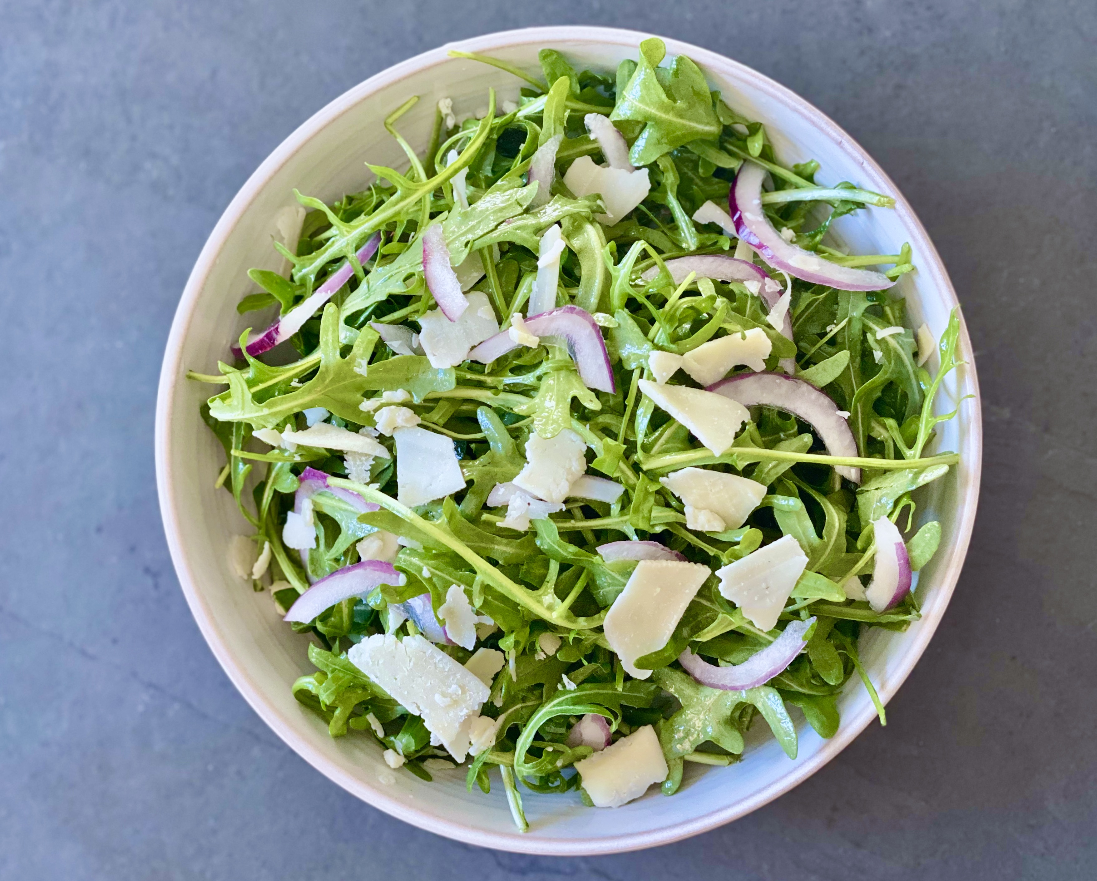 Whenever we are cooking a complex main entrée for dinner, we like to keep the other dishes simple and easy to put together. This recipe will come in handy for just that – bringing you a great salad that is made in under 10 minutes. Salads don’t always need to have a long list of ingredients and complicated dressings to be delicious. This peppery arugula salad is made tangy from the red onion and feels bright and refreshing on the palate from the lemon and olive-oil dressing. We eat this salad almost every week and use it for everything from an appetizer for a coursed dinner to a side dish with veggie burgers. It pairs well with just about everything and we know it will become one of the “go-to’s” in your kitchen as well.