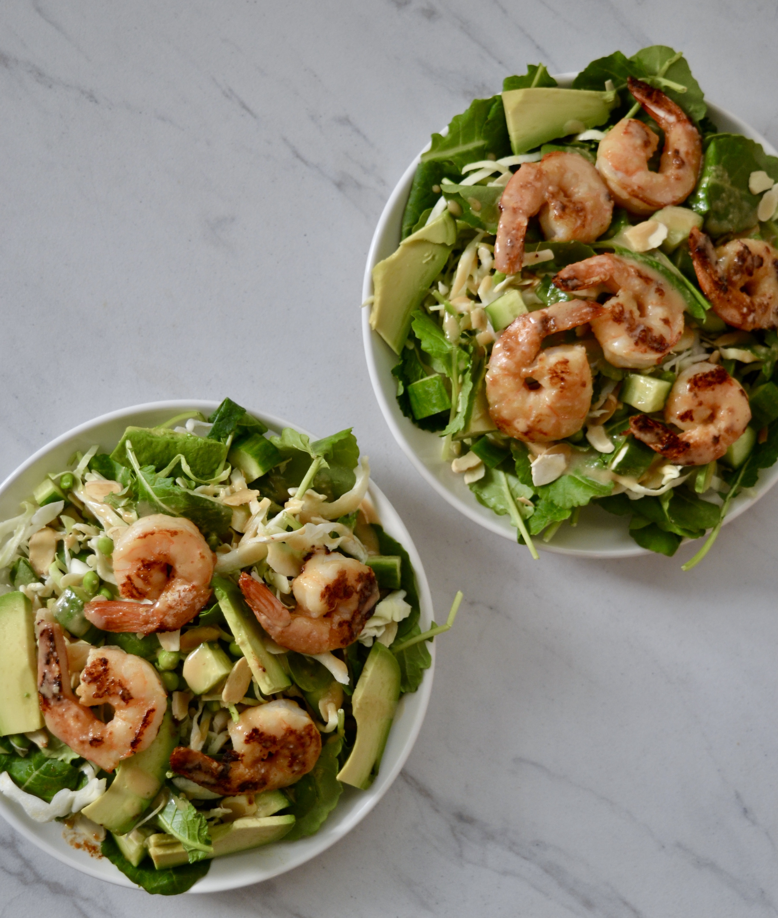- Assemble the salad by layering the baby kale and cabbage on the bottom of a large serving dish. Add the cucumber, spring peas, almonds, and avocado. Top with the shrimp and drizzle with as much dressing as desired. Toss to coat and serve immediately.