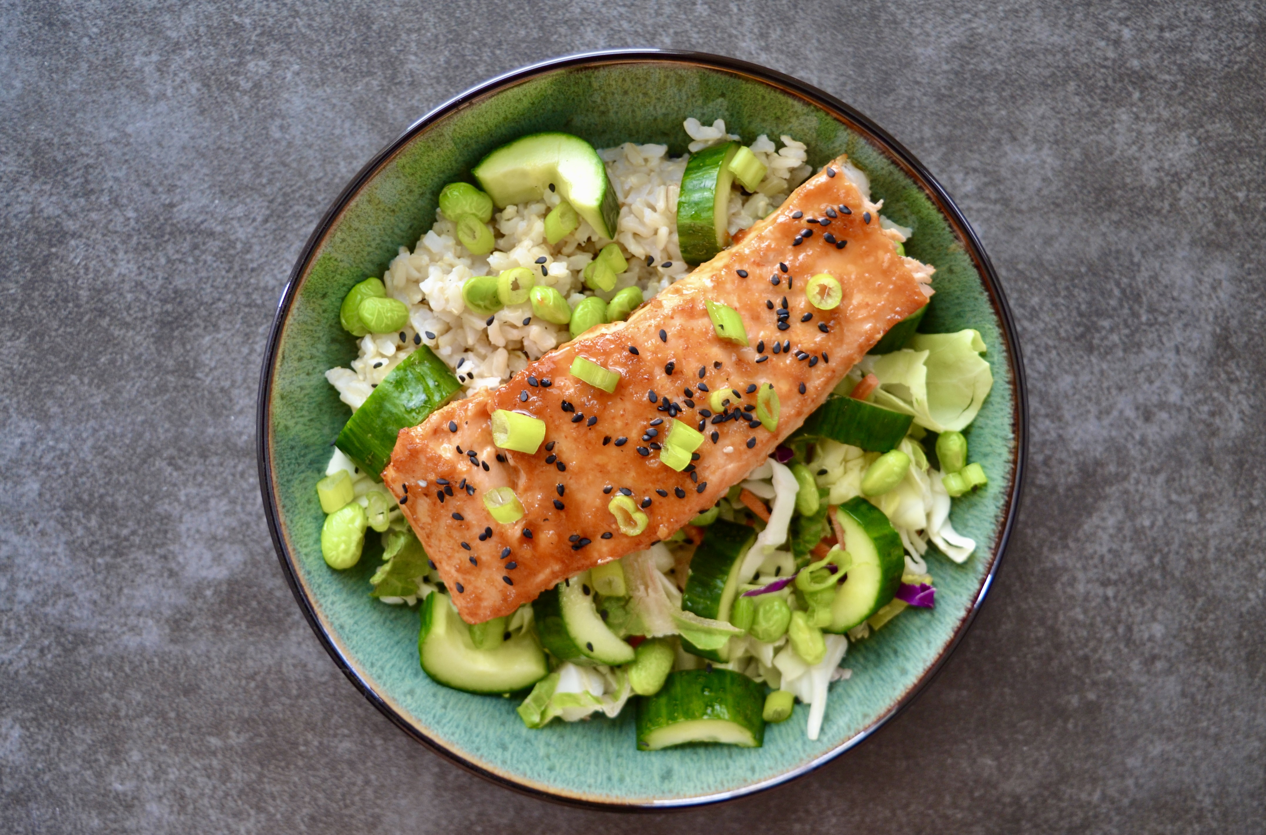 This recipe is one of our favorites for an easy, weeknight dinner option. “Bowls” are a great way to mix and match what we have in the kitchen to form a complete dinner. The centerpiece of this bowl is the salmon – it is salty, spicy, and exploding with fresh Asian flavors. Marinating the salmon is key to getting great results- it really needs at least 30 minutes, ideally one hour, in the refrigerator to absorb all of those flavors. You can serve it bowl style as we have in the photo below or with rice and sautéed veggies for a balanced dinner.