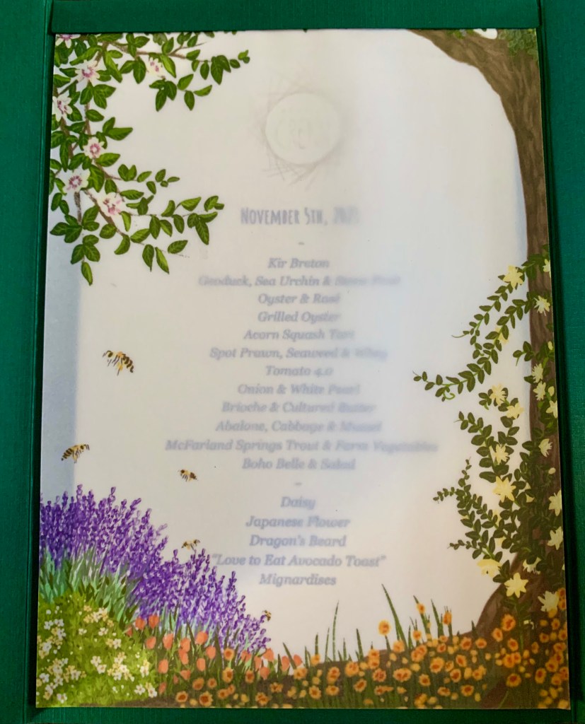Atelier Crenn’s menu is always presented by way of poem leaving both a whimsical and mysterious nature to the dinner. The menu is now fully pescatarian, a change they informed us was implemented within the past few years in an effort to be more sustainable. Chef Crenn draws influences from her home in France and the bay area, weaving a delicious menu combined with traditional French techniques and modern coastal cuisine. Many of the ingredients are sourced from the restaurant’s farm upstate in the Napa Valley. We enjoyed dishes like geoduck clam, abalone with cabbage, trout mousse, and a playful spin on “oysters and rose”. We ate the most beautiful tomato dish comprised of 6+ types of tomatoes and were beyond indulged by a seasonal white truffle course that was irresistible. We don’t like to spoil the experience by sharing what each dish was but can tell you that between the four of us, we each walked away with different favorite dishes because everything was just that creative and memorable.